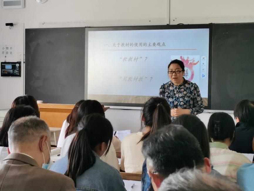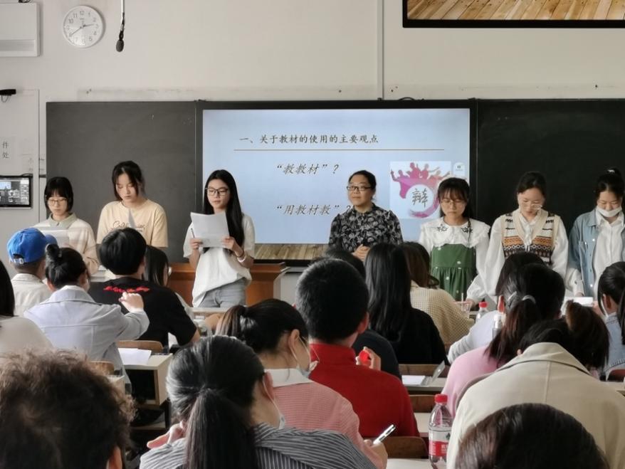 周玲玲老师首先组织了小型辩论赛,引导学生区分“教教材”和“用教材教”的涵义,然后播放了王崧舟老师的《长相思》教学录像,引导学生接触“教材内容教学化”的实践形态,初步形成“用教材教”的教学意识,最后总结出“用教材教”的思想内涵和实践意义。