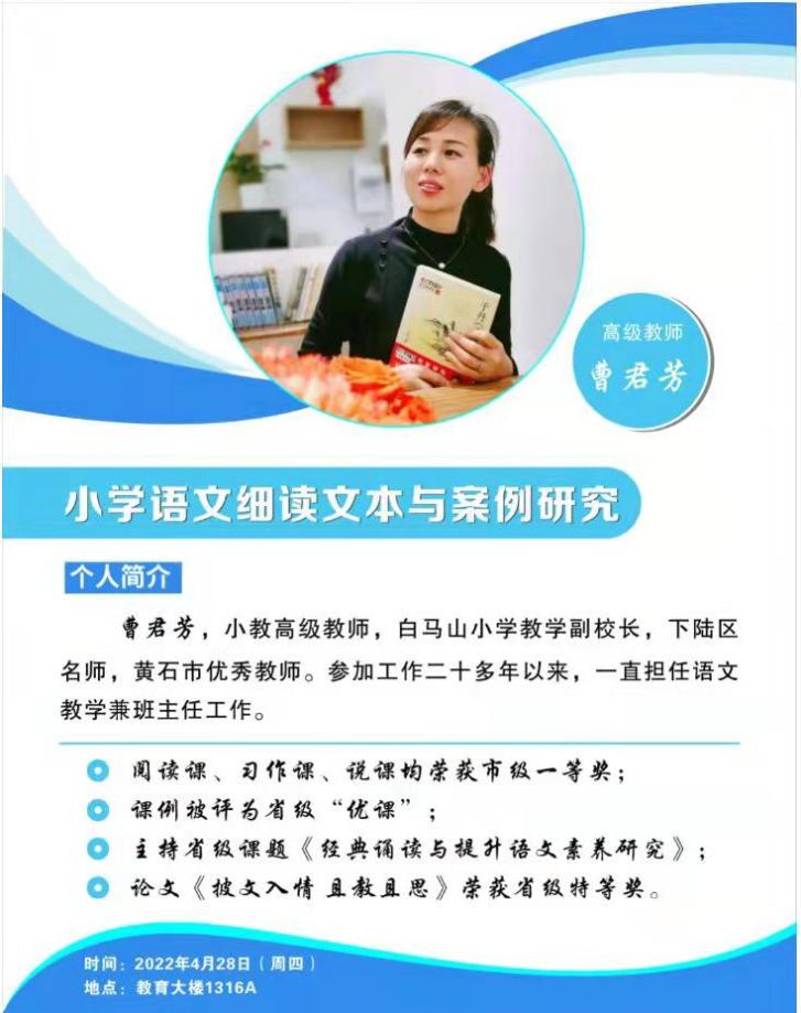 2022428日下午,白马山小学副校长曹君芳在教育大楼1J12举行《小学语文细读文本与案例研究》讲座。本次讲座由崔波副院长主持。