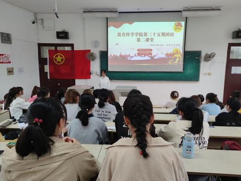 4月28日中午,教育科学学院组织部在教育大楼1j11开展第三十五期团校第二课堂。本次第二课堂由组织部干事向蝶主持,全体团校学员参加本次活动。