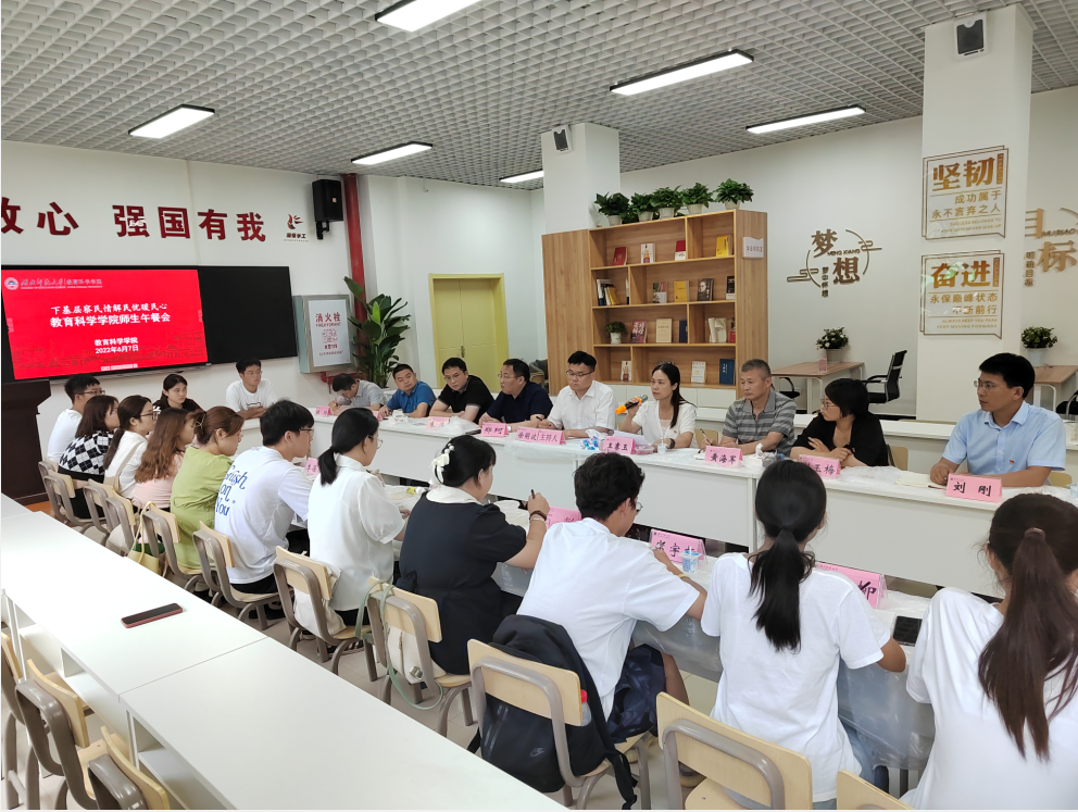 为深入开展下基层察民情解民忧暖民心实践活动,畅通师生信息沟通渠道,我院于6月7日中午在至诚“一站式”学生社区召开师生午餐会。校党委常委、副校长王赛玉出席,学工部(处)、教务处、后勤管理中心等部门负责人,教育科学学院全体领导班子,教育科学学院本科生、研究生党员代表、团学代表参会。教育科学学院党总支书记徐明波主持会议。