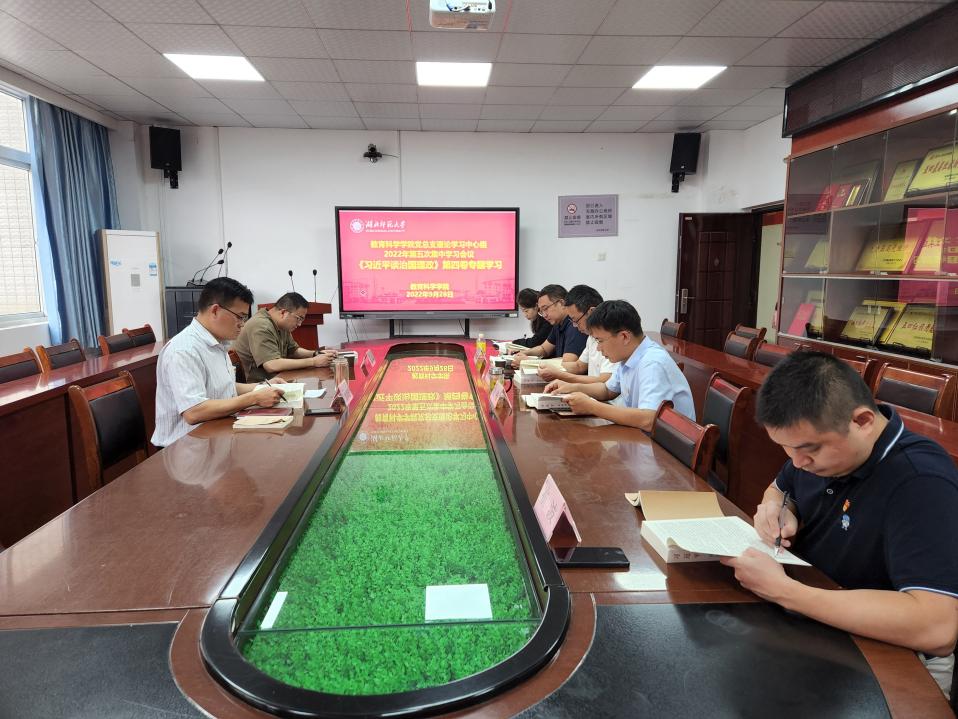 2022928日上午,教科院党总支在教育大楼1317A会议室召开了理论学习中心组2022年第五次学习会议,专题学习了《习近平谈治国理政》第四卷等相关材料。会议由院党总支书记徐明波主持,学院全体班子成员和党政办主任参加了会议。