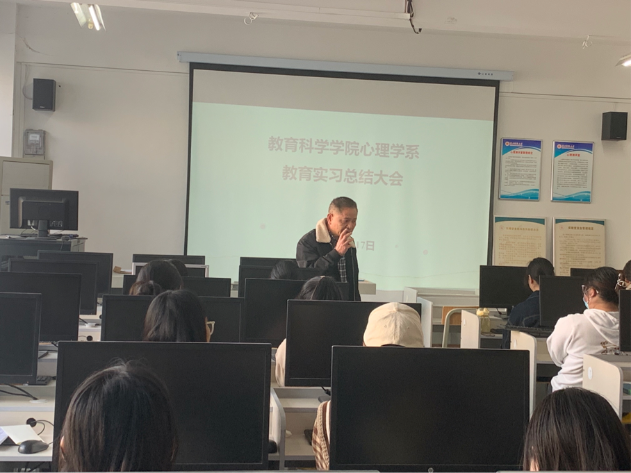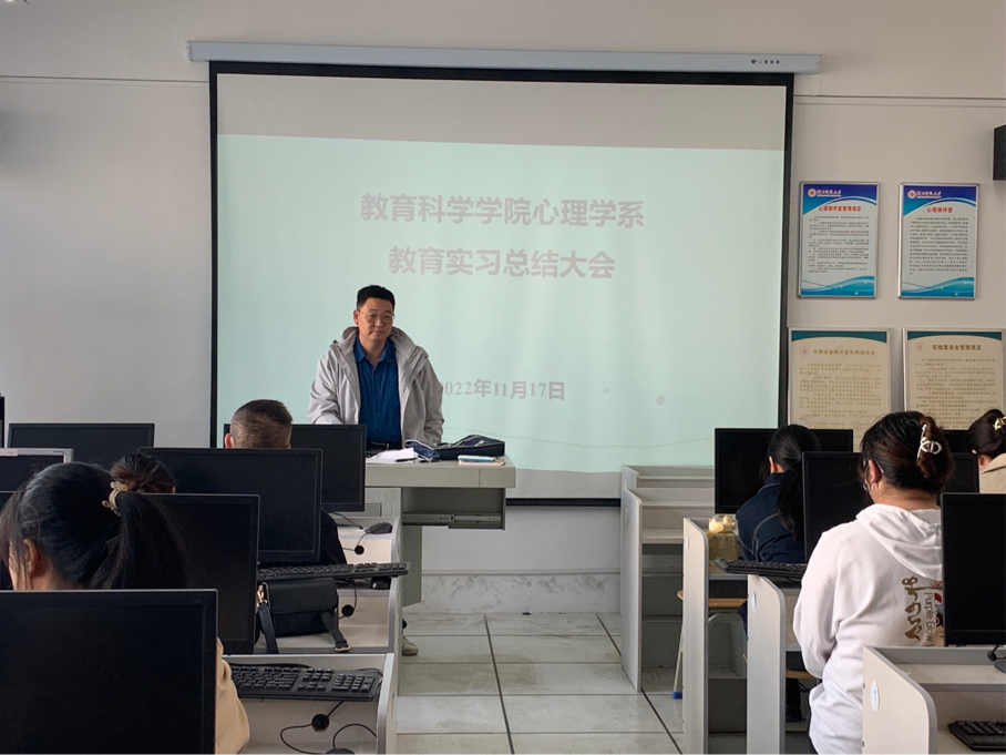2022年11月17日下午1:30,教育科学学院2019级心理学系实习总结大会在教育大楼1713举行。会议由系主任刘艳春博士主持,实习指导教师、1902班班主任曹中保老师出席会议,1902班全体学生参与。