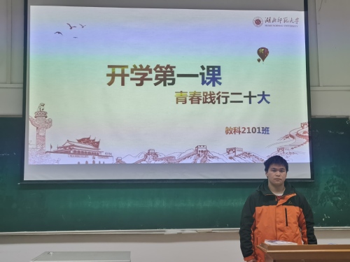 为持续贯彻学习党的二十大精神,引导同学们快速融入新学期的生活,教育科学学院2101班于2月26日晚在教育大楼1j12开展了“青春践行二十大”主题班会。班主任徐燕敏老师以及2101班全体同学参加了本次班会。
