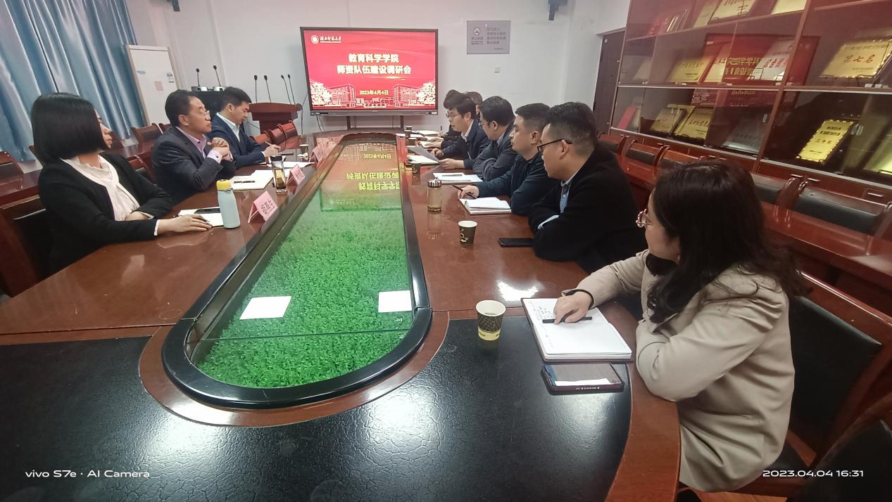 4月4日下午,党委常委肖六亿一行到教育科学学院开展师资队伍建设调研会。人事处相关负责人,教育科学学院班子成员、院长助理和系主任参加调研会。