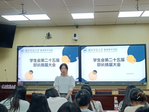为了加强我院学生会组织建设,确保学生会工作顺利交接,教育科学学院于2024年5月28日晚在教育大楼1316A召开了第二十五届部长换届大会,参加本次大会的有第二十四届学生会主席宋米岍玥、翟彩云,第二十五届学生会主席刘施雨、刘诗雅,全体部长和参与竞选的干事。