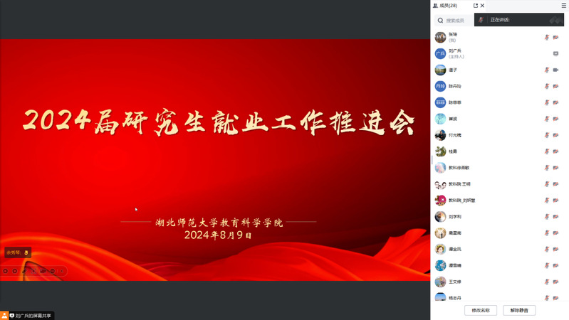 为深入贯彻落实习近平总书记关于做好高校毕业生就业工作的重要指示批示精神,落实教育部、教育厅关于做好毕业生就业创业工作的决策部署,持续做好就业服务,8月9日,教育科学学院在线上举行2024届研究生就业工作推进会。学院党委书记杨志丹,院长朱浩,研究生院副院长周英杰,学院党委副书记刘广兵,副院长崔波,2024届研究生导师参加会议。