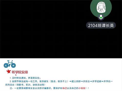 会议伊始,三位23级学班分别从开学前的准备、如何与新生交流相处等多个角度为24级学班提出需要注意的内容和有效的建议,并着重强调了近几年频繁出现的电信诈骗等问题。希望24级学班能够采取多种措施有效的进行防诈骗宣传和教育,宣传反诈骗的知识,保护新生财产安全。随后秦姗姗老师进行总结发言,她提出新学班应清楚了解新生报道的细节工作,并强调了学生班主任这一工作的重要性,鼓励各位学班以饱满的热情投入到新生工作中。