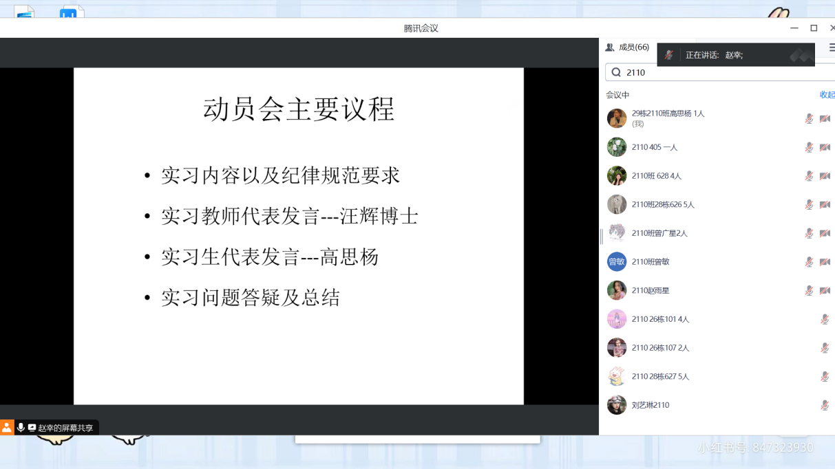 会议主要分为四个环节:首先,小教系系主任赵幸对实习内容总体安排及纪律规范等要求进行系统的讲解,特别强调实习的纪律要求和基本的行为规范等。然后,实习教师代表汪辉博士发言,提醒各位同学实习期间务必注意安全,确保实习工作高质量完成等。再次,实习生代表高思杨发言,她代表全体实习生感谢学校以及学院提供的宝贵锻炼机会,并对即将到来的实习工作充满期待。最后,针对同学们提出的相关问题进行答疑解惑。(供稿人:赵幸)