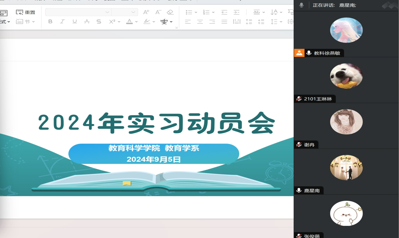 为了让同学们更加积极地参与即将到来的教育实习,并对其过程有一个全面而深入的了解,教育科学学院教育学专业2101班于2024年9月5日8:30至9:30,通过腾讯会议平台成功举办了一场线上教育实习动员大会。教育科学学院教育学系主任鹿星南、2101班班主任徐燕敏及教育学系部分教师参加此次会议,旨在激发学生们的热情,确保他们对实习的每个环节都有清晰的认识和准备。