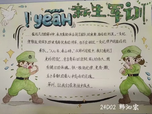 教育科学学院2024级新生军训风采尽显,为传承军训精神,提升军训影响力,学院学生会外宣部精心策划并于9月20日至29日成功举办了“军训风采我来绘”手绘活动。此次活动吸引了众多24级新生积极参与,共同描绘军训生活的点点滴滴。