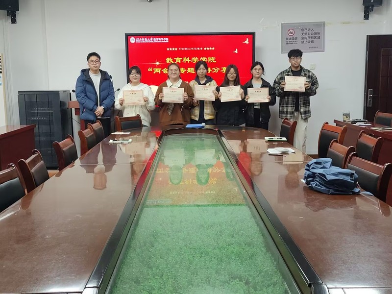 为深入学习和贯彻2025年全国两会精神,进一步汇聚奋进力量,教育科学学院于3月12日中午,在教育大楼1317会议室举办了“两会”专题心得分享会。团委学生副书记许广昊、青年传媒中心部长曾小函以及2024级心得分享同学共同参加了此次活动。